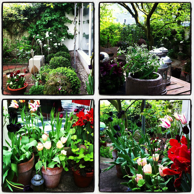 Und da der prognostizierte Regen heute Nachmittag ausblieb, wurden viele der gekauften Pflanzen & Blumen gleich gepflanzt, auf der Terrasse die Kübel neu sortiert und gefegt und anschließend alles bei einer Tasse Kaffee genossen: Vor allem an den Tulpen in Töpfen und dem wunderbar blauen Steinsamen neben der dunkelpurpurnen Petunie hat sich mein Herz erfreut.